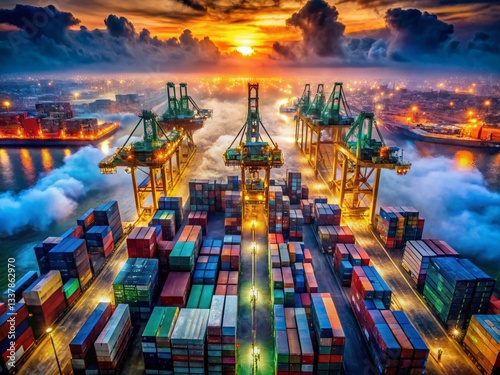 Obraz premium Surreal Aerial View: Container Ship Terminal, Crane & Truck Unloading Operations