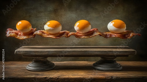 Naklejka premium Surreal Breakfast Scene: Floating Bacon and Eggs Defying Gravity in a Unique...