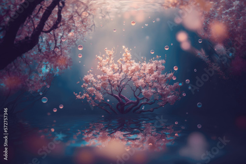 Fototapeta premium surreal cherry blossom tree art with soap bubbles, Generative AI