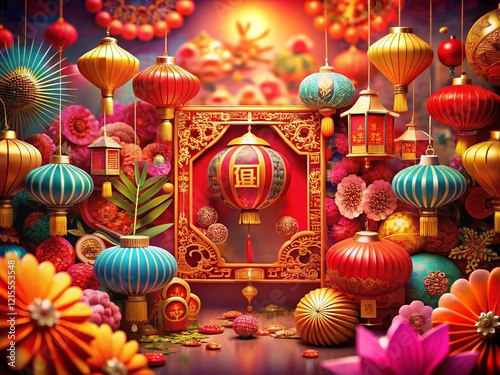 Naklejka premium Surreal Chinese Lunar New Year Background: Oriental Style Motion Graphic Design with Copy Space