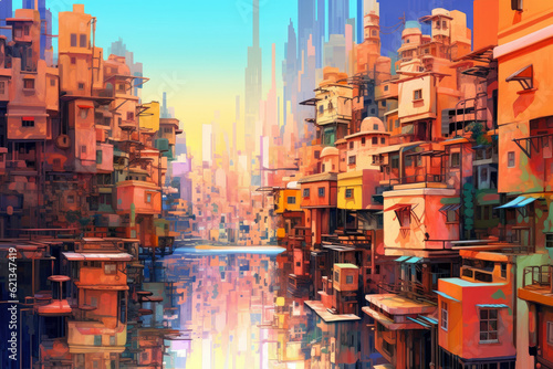 Obraz premium Surreal City Mirage: surreal panorama where reality and illusion blend, creating a mirage-like cityscape with distorted perspectives, vibrant colors, and a sense of mystery