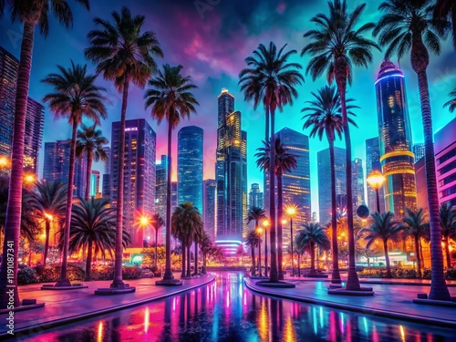 © Four888, Obraz premium Surreal City Palms at Night - Dreamlike Urban Landscape