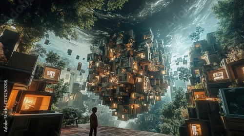 © Infinity, Obraz premium Surreal Cityscape: A Boy Gazes at a Floating City