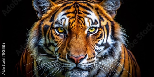 © prapatsorn, Fototapeta premium Surreal Close-up Tiger Face, Black Background - Mystical Wildlife Portrait