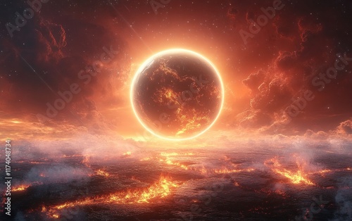 Fototapeta premium Surreal Cosmic Landscape of Distant Planet with Glowing Lava and Dramatic...