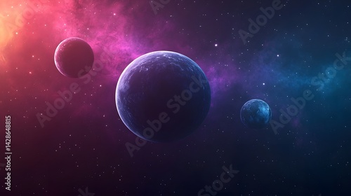 © pkproject, Obraz premium Surreal Cosmic Landscape with Enchanting Planets and Glowing Nebulae in Deep Space
