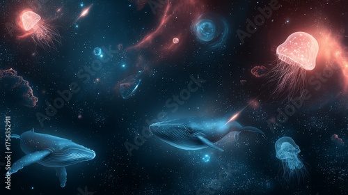© JIALU, Naklejka premium Surreal cosmic ocean with glowing jellyfish drifting among stars, giant space whales swimming through galaxies, colorful nebula waves, and luminous comets crossing the cosmic sea