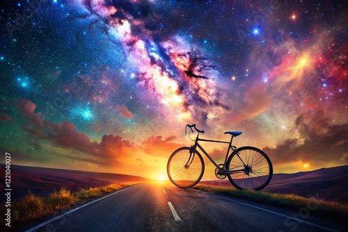 © Man888, Obraz premium Surreal Cycling: A Rennrad Ascends a Starry Sky Road