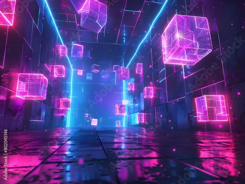 Fototapeta premium Surreal 3D Render of Cyberspace Environment with Floating Geometric Shapes...