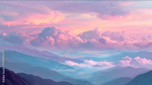 Fototapeta premium Surreal dawn over mountains, layered dreamy clouds, gradient pastels