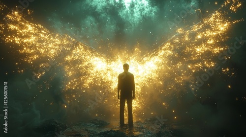 © Bussakon, Fototapeta premium Surreal Depiction of a Glowing Winged Figure Symbolizing Spiritual Ascension and Awakening