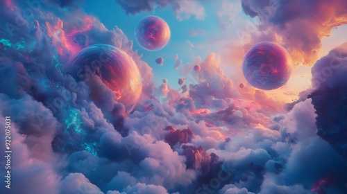 © xxom.o, Naklejka premium Surreal Digital Art of Floating Planets in a Dreamlike Sky