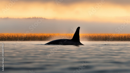 © Dream Vision, Fototapeta premium Surreal Environmental Warning, whale silhouette glides over calm waters at dawn, surrounded by golden fields