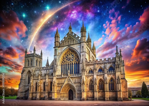© Four888, Fototapeta premium Surreal Exeter Cathedral: Floating Spire & Celestial Glow, Devon, England