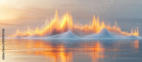 © GoDress, Fototapeta premium Surreal fiery landscape reflecting on calm water at sunset.
