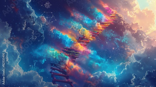 Obraz premium Surreal Figure Climbing Pencil Ladder to Sky with Academic Clouds