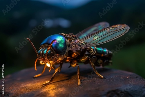 Fototapeta premium Surreal fireflies wearing steampunk at dusk