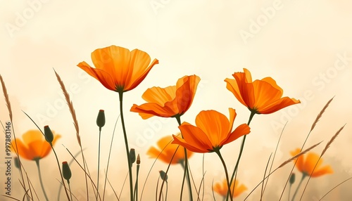 © Mishkat Uddin Rahat, Obraz premium Surreal Floral Composition Orange Poppies in a Pastel Landscape
