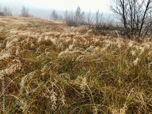 © ICW, Fototapeta premium Surreal foggy icelandic autumn landscape: Rural, wild nature on a windy, wed day with yellow grass and tree silhouettes in an untouched area along the Golden Circle route close to a geothermal region