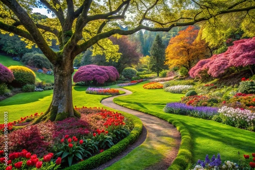 © chaowalit, Fototapeta premium Surreal Garden Path with Tree, AI Photo