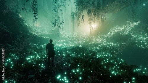 © Aetheria, Obraz premium Surreal illuminated landscape featuring a lone figure amidst bioluminescent flora