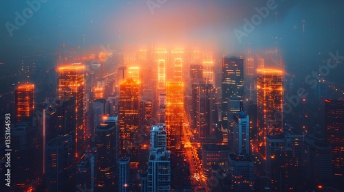 Obraz premium Surreal image of a giant glowing symbol standing atop a corporate city skyline symbolizing brand identity protection