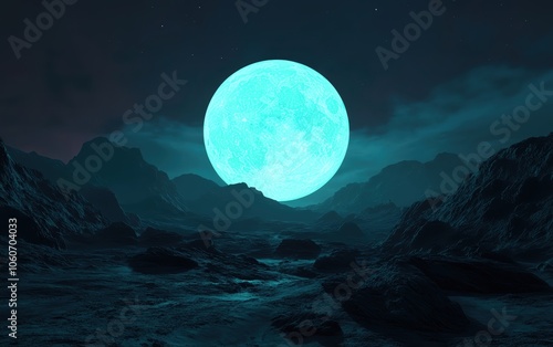 Naklejka premium Surreal landscape featuring a glowing blue moon over rocky terrain with dark...