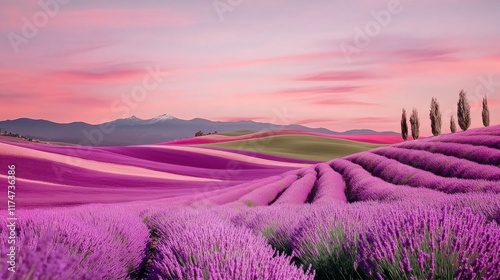 Fototapeta premium Surreal Landscape of Rolling Hills Covered in Vibrant Lavender Under a Pink Sky