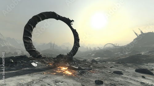 Fototapeta premium Surreal Landscape with Ancient Arch and Alien Horizon at Sunset