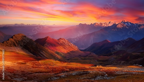 © Quinlan, Obraz premium surreal landscape with colorful mountains at sunset