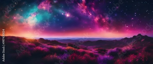 Fototapeta premium Surreal Landscape with Colorful Nebula and Stars Over Mountains