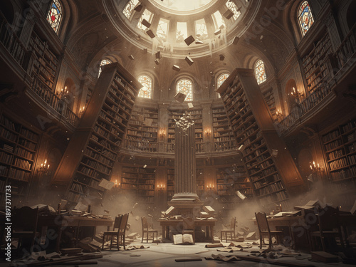 Obraz premium Surreal Magical Library with Flying Books and Tall Bookshelves Under a Domed Ceiling