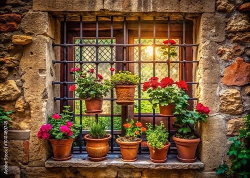 Fototapeta premium Surreal Medieval Barred Window with Flower Pots and Lush Plants on Windowsill in Enchanting Atmosphere for Unique Home Decor and Art Photography