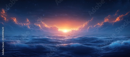 Fototapeta premium Surreal Mystical Landscape Deep Blue Fog Glowing Horizon Ethereal Light...