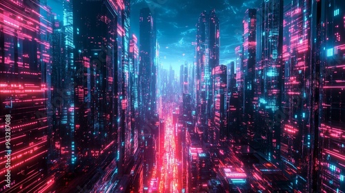 Fototapeta premium Surreal neon city with towering holographic data bars,