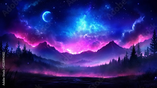 © Xolonavt, Fototapeta premium Surreal night with a celestial sky. Mountains and a vibrant forest create fantasy landscape. Moon and stars align in mystical setting perfect for artistic wallpaper.