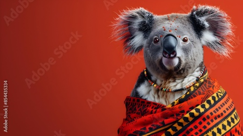 Obraz premium Surreal of an Australian Koala Wearing Aboriginal Inspired Attire on Plain Red Background