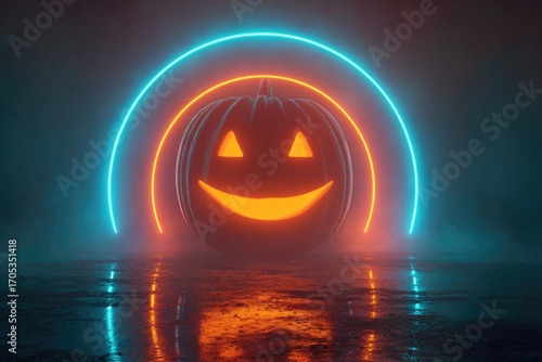 Naklejka premium surreal portal shaped like jack-o’-lantern face, glowing neon lights, sci-fi Halloween design