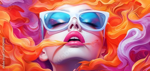Fototapeta premium Surreal portrait of woman with vibrant hair and sunglasses, blending bold...