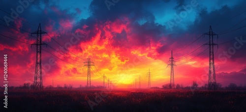 Naklejka premium Surreal Power Lines and Towers with Electric Arcs Against Dark Sky and Bright...