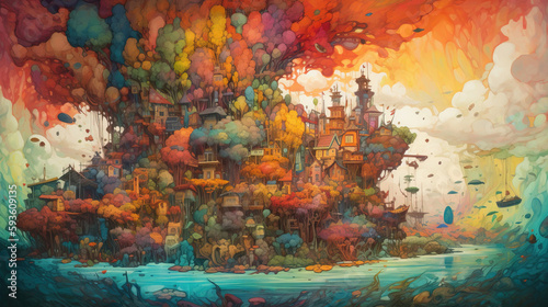 Obraz premium Surreal & Psychedelic illustration, 80s styled Surreal village landscape. Generative AI.