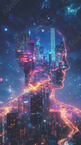 Obraz premium Surreal silhouette of a man blended with a vibrant cityscape in a cosmic...