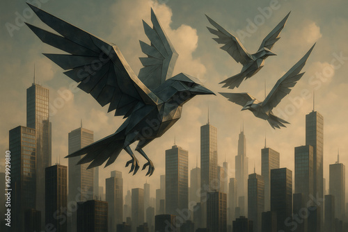 © youngil kang, Obraz premium Surreal Skyline of Metallic Birds