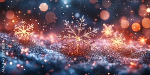 © Pixel Realm, Naklejka premium Surreal snowflake designs with festive glowing tones, Generative AI
