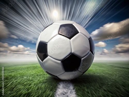 © Four888, Obraz premium Surreal Soccer Ball in Motion on Green Grass with Blue Background for Creative Edits