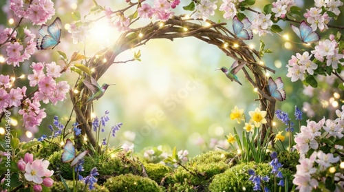 Fototapeta premium Surreal spring bloom enchanted garden nature scene whimsical environment...