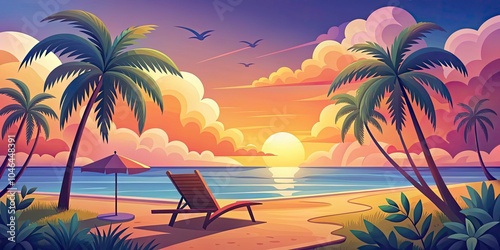 © kansak01, Obraz premium Surreal Summer Escape in Cyprus with Palm Trees and Lounge Chairs - Travel Illustration for Dreamy Destinations