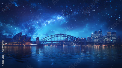 © Thiago, Naklejka premium Surreal sydney harbour bridge: dreamlike cityscape at dawn. Cosmic Bridge. Illustration