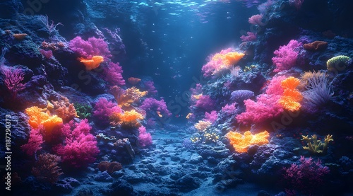 © Janis, Fototapeta premium Surreal Underwater Landscape with Glowing Coral - Generative AI