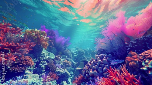 Naklejka premium Surreal underwater scene, coral reefs in psychedelic colors